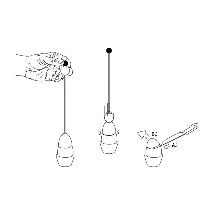 Einfach den „CLACK“ auf das Ei setzen und die Edelstahlkugel nach unten fallen lassen. Durch die Kante an der Innenseite ensteht eine schnurgerade Bruchstelle am Ei, bei der es sich dann mühelos mit einem Messer durch Abheben teilen läßt.