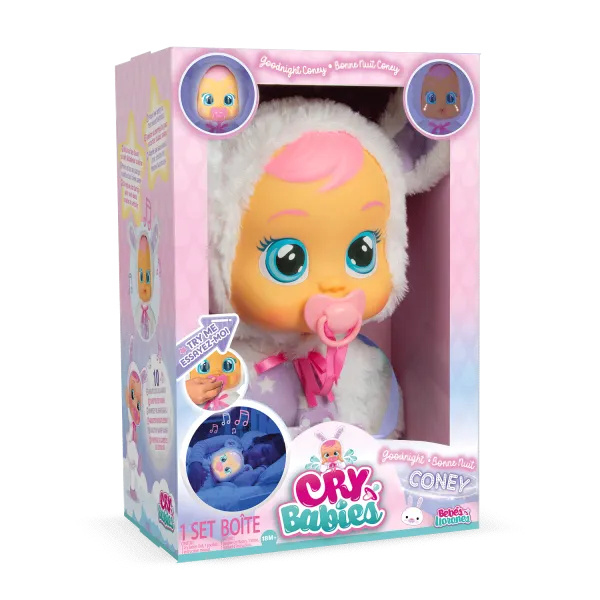Goodnight Coney ist bereit, Kindern zu helfen auf magische Weise einzuschlafen. Deshalb hat sie einen sehr weichen Körper und trägt einen superweichen Anzug. Wenn du ihren Schnuller wegnimmst, weint sie Tränen aus Licht in der Dunkelheit und macht ein weinendes Geräusch. Aber wenn du ihr ihr Schnuller zurückgibst, leuchtet ihr Gesicht auf.