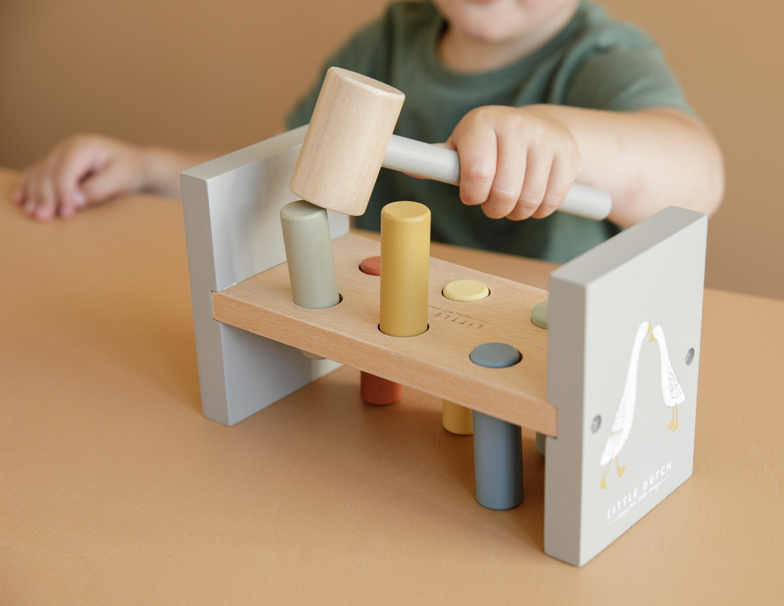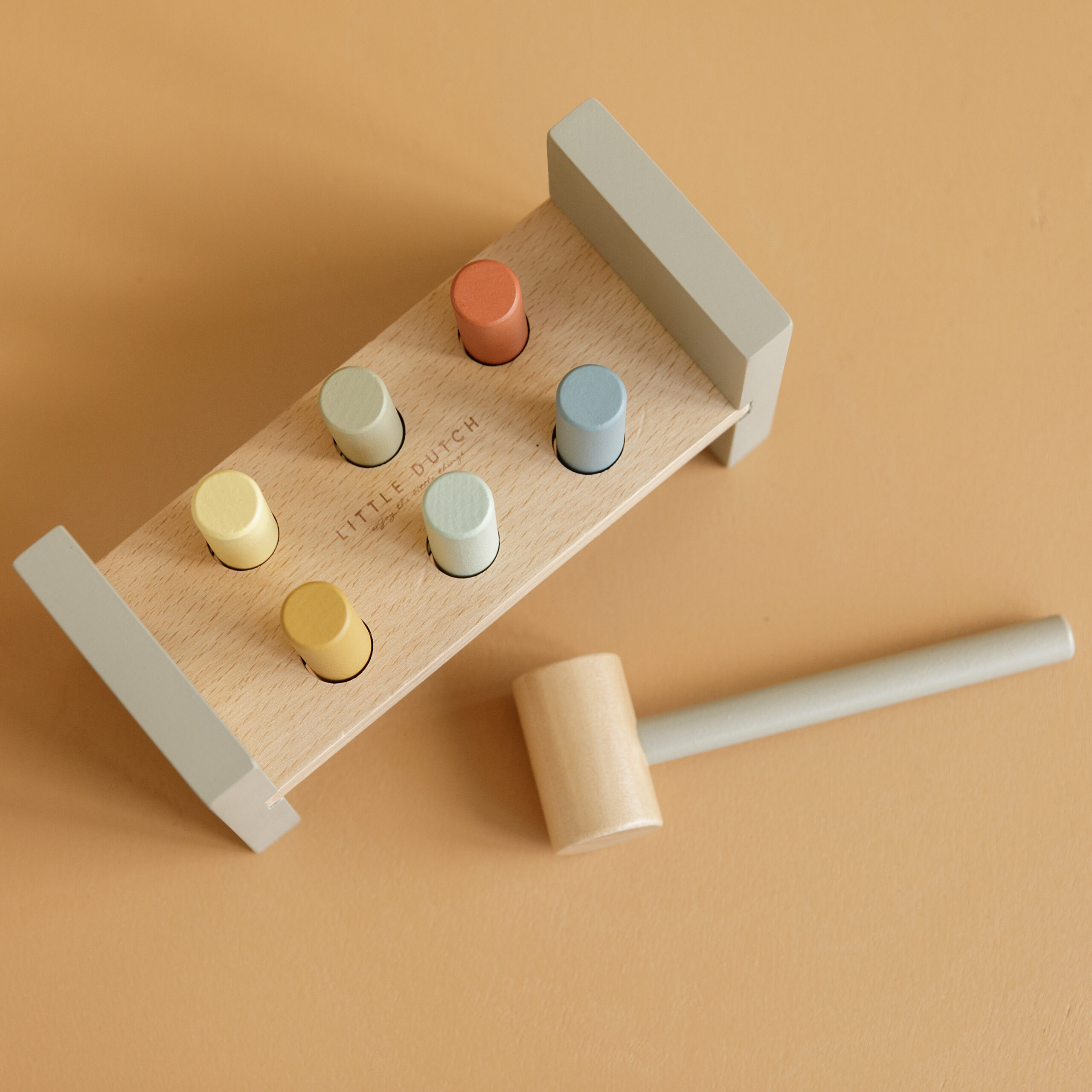 Inhalt:1 Hammerbank aus Holz, 6 Klopfstifte, Hammer